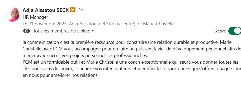 J’accompagne particulièrement les femmes à mieux communiquer, non pas quand tout va bien…mais quand c’est difficile, sensible, émotionnel afin de transformer leurs interactions en leviers de performance, croissance et de sens, grâce au Process Communication Model®, à la PNL et aux outils de développement personnel.